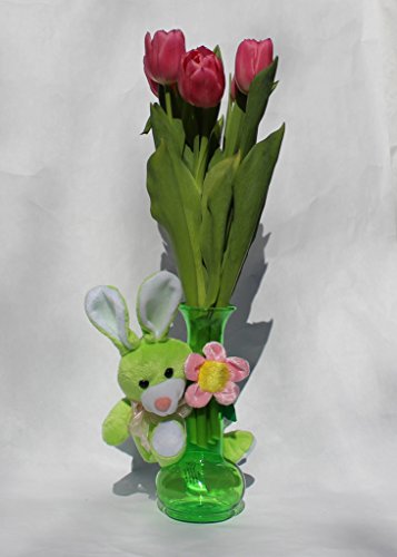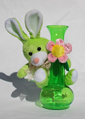 Bunny Rabbit Plush Hugs Green Acrylic Vase in Bright Spring Color - Add Fresh Flower Bouquet