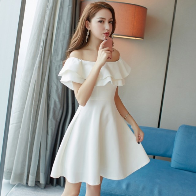 胸元のエレガントなフリルデザインのパーティードレス。