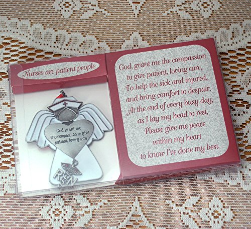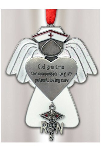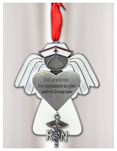 Nurse Angel Ornament - RN Caduceus Charm Hanging From the Metal Heart Which Says God Grant Me the Compassion to Give Patient Loving Care - 3.25" - Gift Boxed