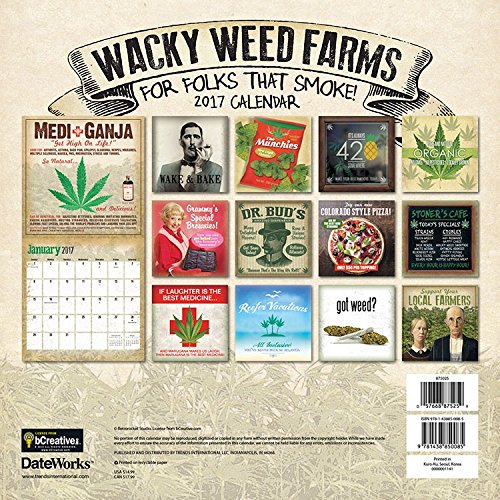 -. Binding : Office Product -. Brand : Trends International -. EAN : 0709257563053 -. Feature : 2017 Calendar featuring beautiful images for every month of the year. / Includes Holidays and Observances. / Keep your appointments and Birthdays organized in one place! / Perfect for office spaces, bedrooms, classrooms and more! / Makes a great gift for friends and family! -. Label : Trends International -. Manufacturer : Trends International -. MPN : 875025 -. PackageQuantity : 1 -. PartNumber : 875025 -. ProductGroup : Office Product -. ProductTypeName : OFFICE_PRODUCTS -. Publisher : Trends International -. Studio : Trends International -. Title : 2017 Wacky Weed Farms Calendar - 12 X 12 Wall Calendar -. UPC : 709257563053