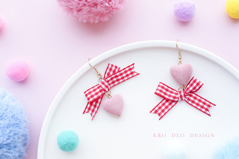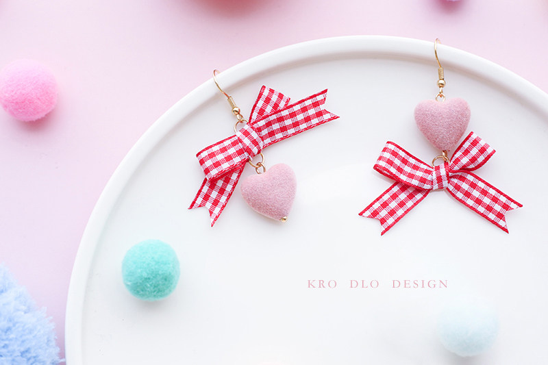 | 尺寸:全长5.3cm 直径5.5cm | 材质:925银针 保色合金 植绒爱心 格子蝴蝶结 |