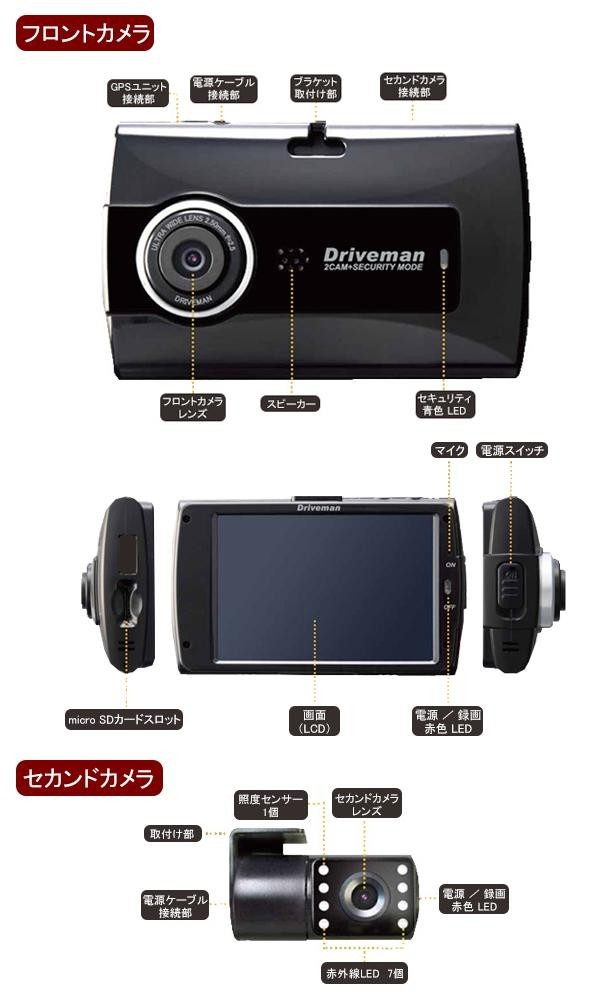 | 「ドライブマン」シリーズ初のセパレートタイプの2カメラモデルのドライブレコーダーです。HD画質で全国LED信号対応前方用フロントカメラと、赤外線LED付きの車内撮影向けSD画質セカンドカメラの同時録画が可能です。 |