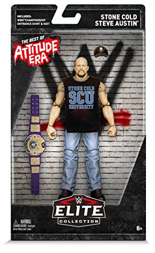 Capture the blowout action of WWE with this Best of Attitude Era Stone Cold Steve Austin Elite figure! Featuring one of the WWE's biggest personalities and champions, this bold and colorful figure comes ready to wreak havoc right out of the box! Figure has deluxe articulation, a detailed character expression, authentic ring attire and iconic accessories. Includes Stone Cold Steve Austin WWE Championship Title, signature hat and cut-off T-shirt. Let the battle begin! Colors and decorations may vary.Feature
