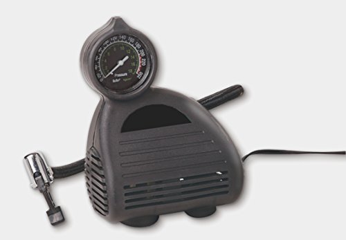 -. Feature : EMERGENCY PORTABLE AIR COMPRESSOR Don't be caught unprepared when driving in your car and keep this 12 Volt Tire Inflator handy. This durable portable car tire inflator features an easy to read pressure gauge to measure inflation up to 250 PSI. Just plug into your automobiles 12V cigarette lighter adapter. The power wire extends to 8.5 feet to allow inflation of tires and other objects. / INFLATES TIRES BALLS AIR MATTRESSES AND MORE Use the included nozzle adapters to inflate motorcycle tires, sports balls, inflatable boats, pool toys, blow up mattresses and more with power from a 12V adapter only. / EASY TO USE Just plug into any 12V car adapter and start reading the tire gauge and inflate your car tire to your manufacturers specifications.