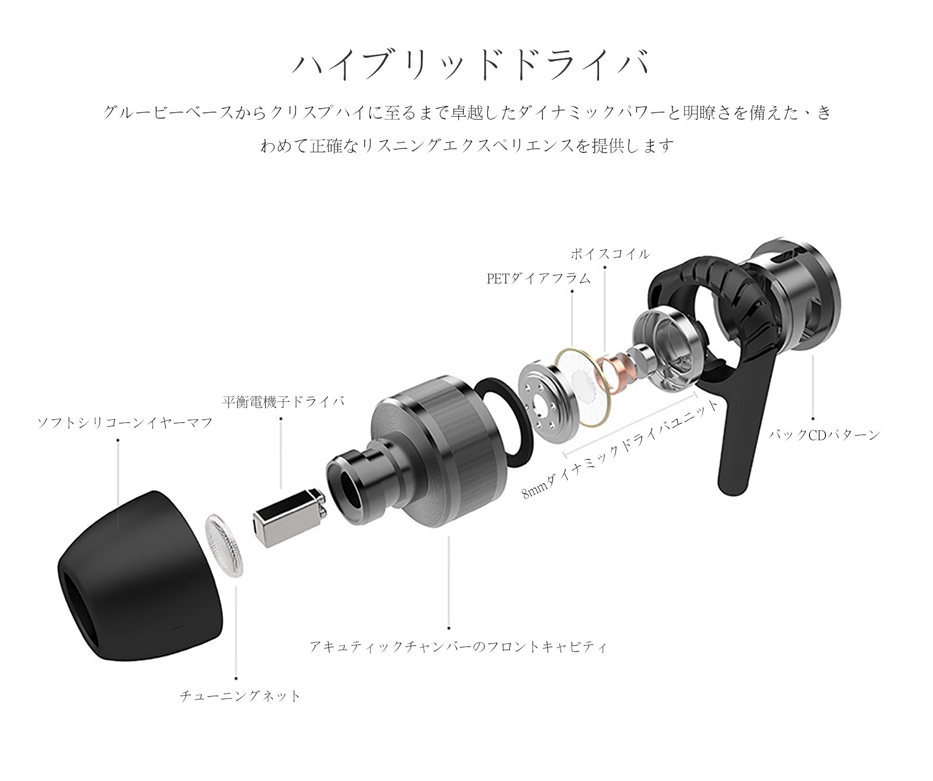 ● Earphone with built-in microphone adopts a double unit structure consisting of dynamic driver and balanced armature divider, realizing true sound reproduction of deep bass without distortion.