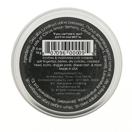 -. Feature : Soothes any skin condition that needs deep moisturizing and nourishing. Great for burns, cuts, scrapes, rashes, cracked cuticles and heels, tissue nose, road rash, abrasions, diaper rash, and poison ivy. Formulated for and used by the gnarliest rock climbers the world has ever seen—if it works for them, it will work for you, too. / Ingredients: grapeseed oil, apricot kernel oil, yellow beeswax, wheat germ oil, tocopherol (vitamin E), and Climb On!’s proprietary blend of 100% pure essential oils. Free from parabens, harsh preservatives, petroleum-based ingredients, artificial colors, fragrances, dyes, detergents, etc.. Size: 1 oz..
