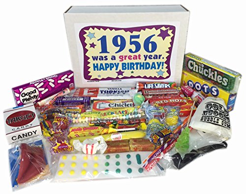 -. Binding : Grocery -. Brand : Woodstock Candy -. Feature : Contains thirty kinds of retro nostalgic candy / 1956 birthday gift box filled with nostalgic candy is sure to bring back memories to a baby boomer / Makes a fun and unique 61st birthday gift for someone who has everything / Great gift for any candy lover / Box measures 9.5 x 7 x 3 inches and comes shrink wrapped -. IsAdultProduct : 0 -. Label : Woodstock Candy -. Manufacturer : Woodstock Candy -. PackageQuantity : 1 -. ProductGroup : Grocery -. ProductTypeName : GROCERY -. Publisher : Woodstock Candy -. Studio : Woodstock Candy -. Title : 61st Birthday Gift Box of Nostalgic Retro Candy from Childhood for a 61 Year Old Man or Woman Born in 1956- 50s Decade Jr