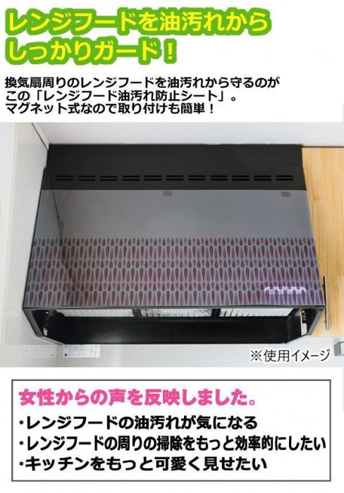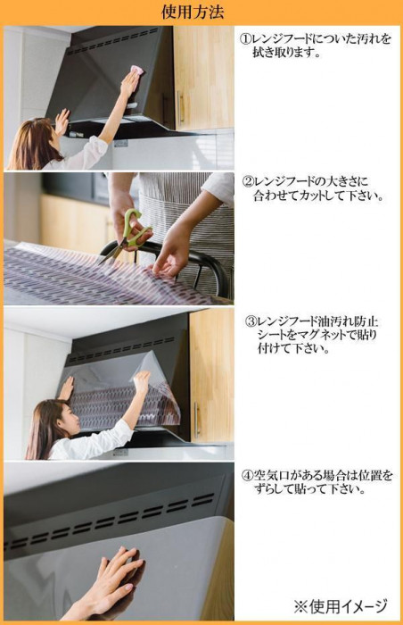 | 付属のマグネットでレンジフードに貼り付けるだけで油汚れからレンジフードをガード。汚れた時の取り替えも簡単です。ハサミで好きな長さにカットできるので、様々なサイズのレンジフードに対応します。 |