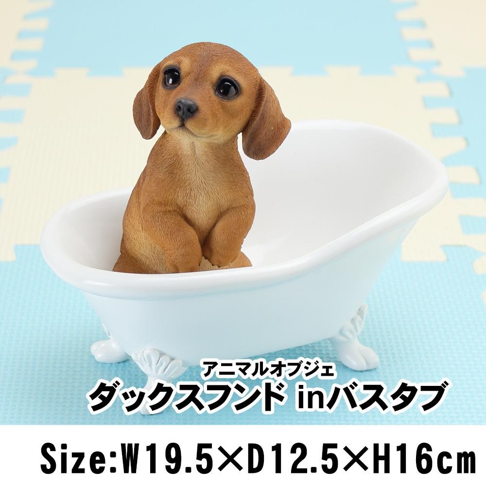 バスタブにちょこんと入った、子犬のダックスフンドのオブジェです。バスタブの中で思い思いのポーズでくつろぐ姿に癒されます。バスタブ部分は、小物入れやフラワーベースとしてもご使用いただけます♪きれいな仕上げで、まるで生きているかのような、愛らしい仕草や表情が特徴です。 |