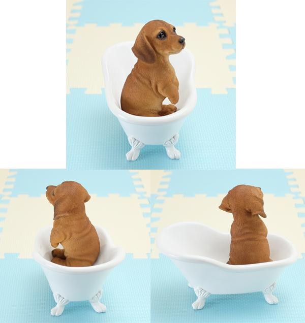 | バスタブにちょこんと入った、子犬のダックスフンドのオブジェです。バスタブの中で思い思いのポーズでくつろぐ姿に癒されます。バスタブ部分は、小物入れやフラワーベースとしてもご使用いただけます♪きれいな仕上げで、まるで生きているかのような、愛らしい仕草や表情が特徴です。 |