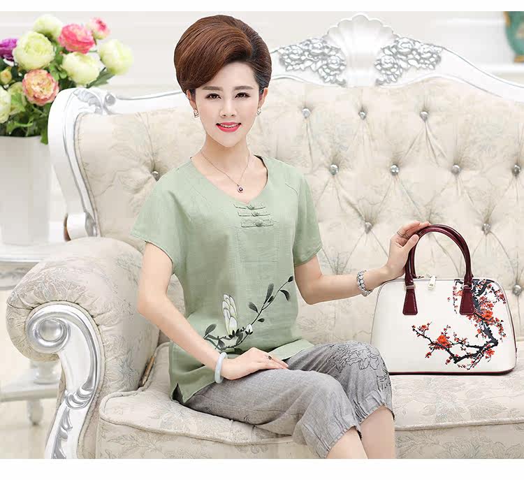 中老年套装女装夏装两件套大码妈妈装棉麻套装短袖T恤七分裤