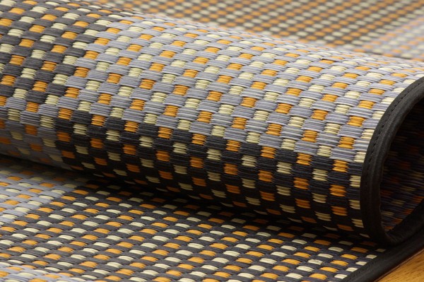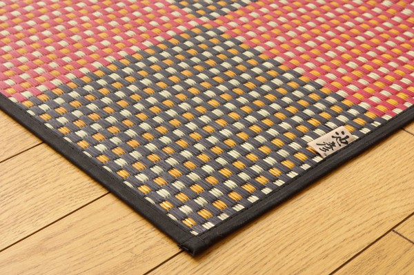 デザイン、品質等を評価される福岡県の2007年品評会で優秀賞を受賞した花ござカーペットです。袋織りよりもさらに鮮明に色柄を出した三重織りで仕上げました。有機肥料(牛糞、豚糞、稲ワラなどをブレンドしたもの)を使った減農薬栽培の国産(九州産)のい草を使用しています。一般のい草と比べ耐久性や弾力性に優れています。一般のい草と比べて色の褐色が遅く、青さが長く残ります。月日を追うごとに飴色に変化し、より気品が増します。またい草一本一本を手作業で選別し選りすぐられた良いものだけを使用するため味わい深い花莚、すばらしい一品となります。い草には空気の自然浄化作用、湿度の調節作用などがあります。また汚れにくく、使用するうちに黄金色に変化し味が出ます。い草に青森ヒバ加工を施しています。(抗菌、防臭効果)