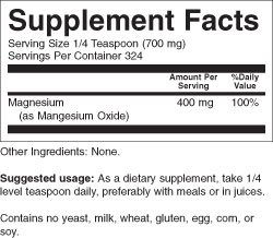 ReleaseDate : 2013-10-15 Studio : NOW Foods- Nutrition and Wellness Publisher : NOW Foods- Nutrition and Wellness Binding : Health and Beauty Product Description Magnesium Oxide is derived from ancient oceanic deposits and is a rich source of elemental magnesium (58% average).? Magnesium is an essential mineral that plays a key role in the activation of amino acids for protein biosynthesis and is highly concentrated in intracellular fluid and bone.* 0