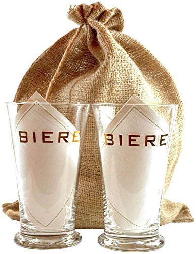 The perfect gift for any beer lover, this set includes two 16 oz. Belgian-style "Biere" glasses for holding a favorite brew, and two natural linen cocktail napkins, all packaged in a reusable drawstring burlap bag. Glasses 6 1/4" H x 3 3/4" W, napkins 4 3/4", bag 10" x 14". Hand wash recommended. Glasses made in China, napkins made in Spain.