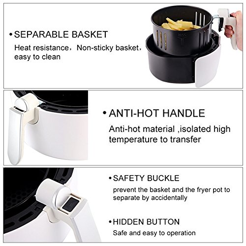 2.6L Capacity and and Easy to Clean: 2.6L(2.7 Qt) air fryer provides enough capacity to cook delicious fried food for family; With one remove button, the detachable basket and removable pan makes it easy to transfer food to the plate, and easy to clean with hot water, washing-up liquid and non-abrasive sponge