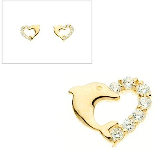 10KT Gold lovely polished heart and dolphin earrings with CZ accents