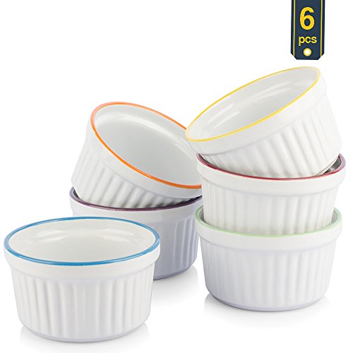 Uno Casa Ceramic White Souffle Dishes, Ramekins - 5 Ounce For Souffle, Creme Brulee and Ice Cream - Set of 6, White with Colored Rims - Package Quantity of 1 includes 6 Ramekins