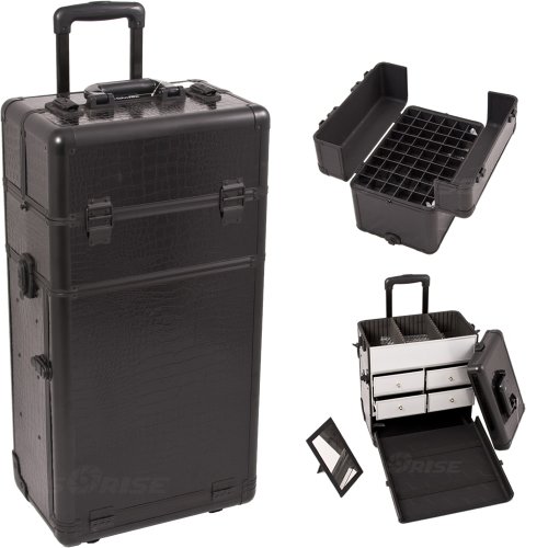 Sunrise I3265CRAB Black Crocodile Professional Rolling Aluminum Cosmetic Makeup Craft Storage Organizer Case French Door Opening with Split Drawers and Easy Slide and Extendable Trays with Dividers