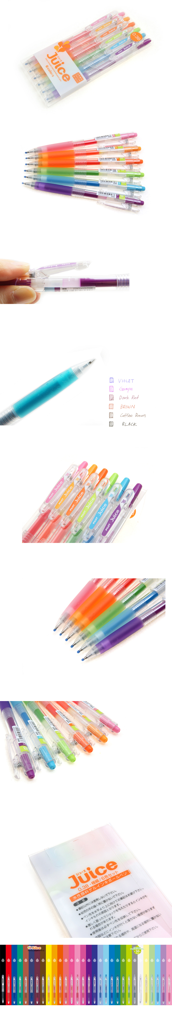 Juice는 간단하면서도 강한 펜이다. 36가지의 다양한 컬러에 안료 잉크로 오래도록 변색이 잘 되지 않고, 방수 또한 가능하다.