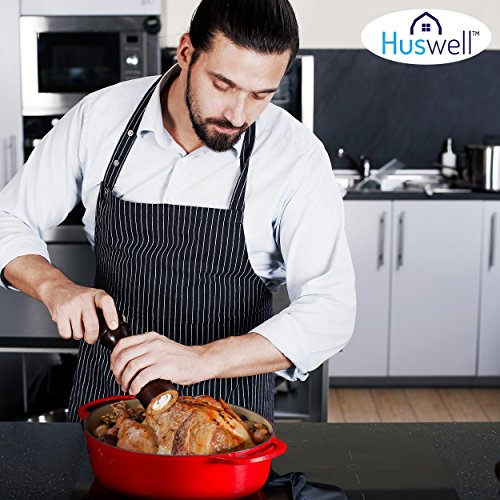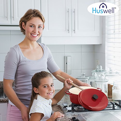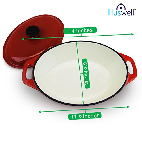 -. Brand : Huswell -. Color : Fire Red -. EAN : 0646437139847 -. Feature : Cookware made with durable porcelain enamel finish to withstand every day use / Deep five-quart oval roaster is safe for cooking with all hob types, including induction / Even and consistent heat distribution helps ensure meals are evenly cooked - each and every time / Enameled fire red exterior and cream colored interior will complement any kitchen décor / Easy to clean and maintain its great looks -. ProductGroup : Kitchen -. ProductTypeName : KITCHEN -. Size : 5 quart -. Title : Huswell Enameled Cast Iron Oval Dutch Oven, Casserole Dish, 5 Quart, Red -. UPC : 646437139847