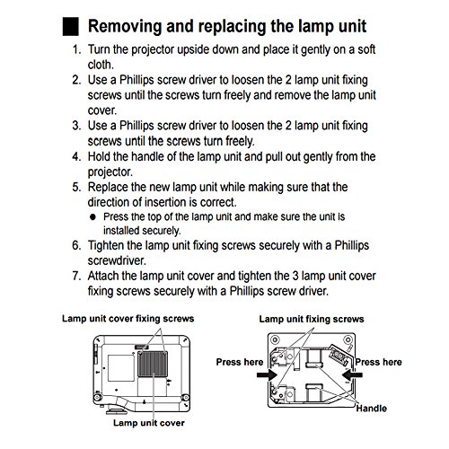 1.?Be sure to use an ET-LAX100 Projector Lamp for replacement.? If you use lamps other than the ET-LAX100, the unit may malfunction.? 2.?Be sure to turn off the unit and unplug the power cord before replacing the lamp 3.Be sure to install the lamp unit and attach the lamp unit cover securely.?If they are not installed securely, it may cause the protection circuit to operate so that the power cannot be turned on.? 4. Grip the handle and keep the lamp unit paralleled when you remove the lamp unit.? Some parts of the lamp unit are sharpened and may cause injury.? Wait for at least 1 hour for the lamp to cool.?Do not touch the surface of the lamp If you touch it, wipe off the fingerprints with a soft cloth