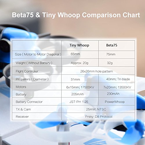Manual about binding with Spektrum radio: https://betafpv.freshdesk.com/support/solutions/articles/27000033588-how-to-bind-the-radio-transmitter Description: The Beta75 is only about 1cm larger than the Tiny Whoop Quad. The biggest difference is the propulsion system. With 7x20mm motors and tri-blade 40mm props, it feels very fast, perfect for indoor racing and acro flying. The performance in outdoor is also great, handles the light breezes very well where the Tiny Whoop tend to struggle to stay level. It has a motor to motor distance of 75mm ( 65mm for Tiny Whoop ). The width and length of the quad measure at 105mm. Compared to other micro quads with brushless motors, the price of Beta75 is really attractive, perfect for beginners and FPV racers alike. Specification: Wheelbase: 75mm Weight: 32g (without battery) Flight Controller: BETAFPV F3 EVO Brushed FC with DSMX receiver Firmware Version: Betaflight SPRACINGF3EVO 3.1.6 Motor: 7x20mm Coreless Brush Motor, 17500KV Receiver: Frsky D8 potocol with PA Camera and 5.8G Tx: AIO 520TVL 1/4 Inch Camera 25mW 40CH Batterry: 3.7V 230mAh Lipo battery with PowerWhoop connector Flight time: 3 min 30 second Package: 1 * BNF Beta75 Micro FPV Quad ( DSMX Rx ) 1 * BETAFPV 230mah 1S Lipo Battery 0