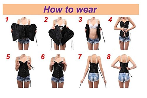 Binding : Apparel Product Description Kranchungel Women's Vintage Underbust Corset Bustier Waist Cincher Bodyshaper Our corsets can be worn as clubwear, burlesque stage costumes, gothic clothing, evening wear or even bridal wear. Whatever you're shopping for, we've got something that will make you look and feel fabulous. Corset is in order to make a more slender body,please don't compare with the general clothes' size. How to wear a tightlacing corset. It might be helpful to have assistance the first time you try on your corset but dont worry with a little practice they are easy to put ion by yourself. 1. Loosen the corset by undoing the centre loops and pulling the back of corset apart 6-7" but dont undo the laces at the bottom of the corset . 2. Undo the front busk and put the corset around you - just like you are putting on a belt . 3.Fasten the front bust starting at the top and work towards, make sure loops are fastened. 4.Gently pull the centre loops to the tighten your corset . Corsets must be worn-in gently, if you tighten them up too much too quickly it can damage the corset. When you first put your corset on pull the lacing so it fits comfortably and snug but not too tight, after a while you should feel that the material has stretched slightly/your body has got used to the fit, so you will be able to tighten some more, this could happen a few times until you have it at its tightest fit. If you follow these instructions your corset should last a long while. About us Kranchungel owns its own trademarks. Our trademark is protected by Trademark Law. Trademark number:86732648 You can click (Kranchungel) to view the other style or color If you have any questions after you order it,please contact us and we would like to do our best to help