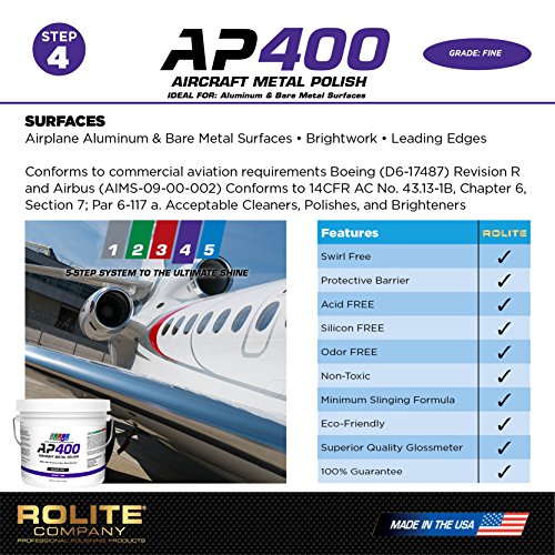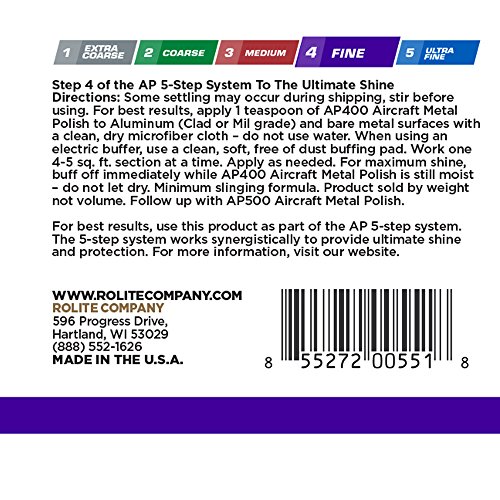 ReleaseDate : 2017-09-20 Studio : Rolite Company Publisher : Rolite Company Binding : Misc. Product Description AP400 Aircraft Metal Polish Step 4 of the AP 5,Step System To The Ultimate Shine Directions: Some settling may occur during shipping, stir before using For best results, apply 1 teaspoon of AP400 Aircraft Metal Polish to Aluminum (Clad or Mil grade) and bare metal surfaces with a clean, dry microfiber cloth ? do not use water When using an electric buffer, use a clean, soft, free of dust buffing pad Work one 4,5 sq ft section at a time Apply as needed For maximum shine, buff off immediately while AP400 Aircraft Metal Polish is still moist ? do not let dry Minimum slinging formula Product sold by weight not volume Follow up with AP500 Aircraft Metal Polish For best results, use this product as part of the AP 5,step system The 5,step system works synergistically to provide ultimate shine and protection 0