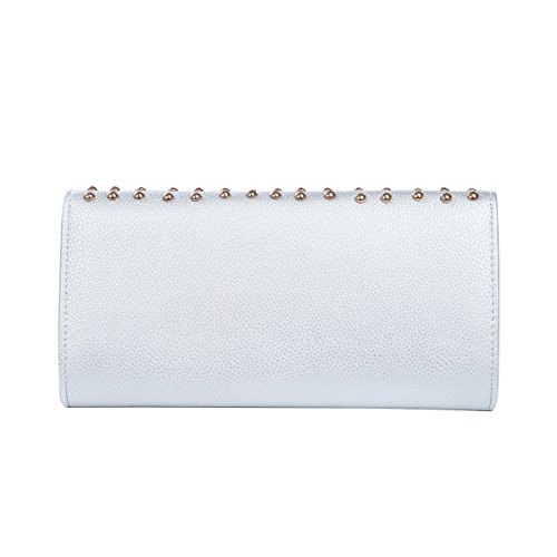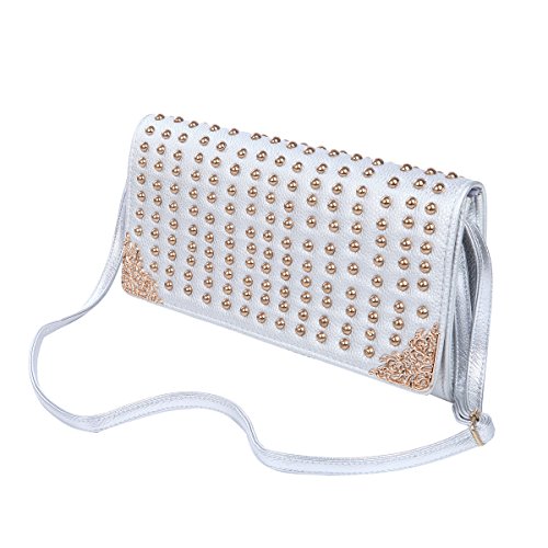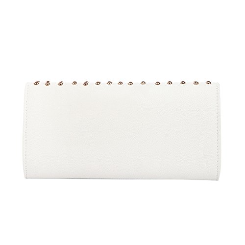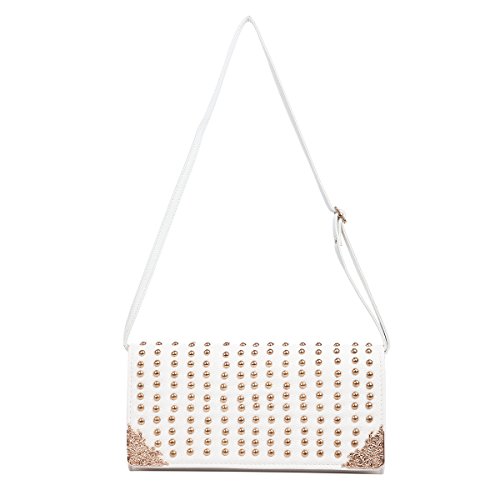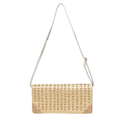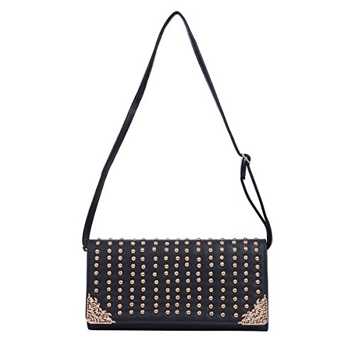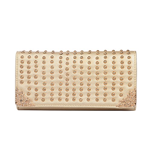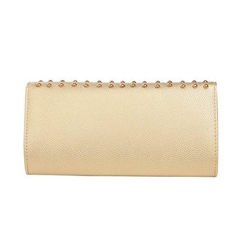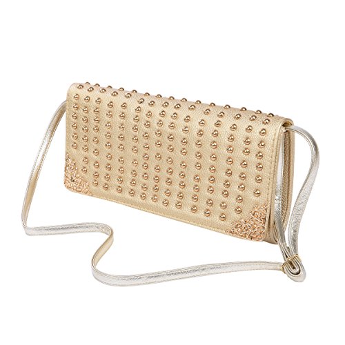 Product Description This high quality clutch bag is both unique and stylish. Durable PU leather outer with classic solid colors and gold tone studded front. Both chic and functional. Roomy enough to hold daily essentials. Fully lined with inner wall zip pocket and magnetic-flap closure. Gold tone hardware. Removable hideaway shoulder strap with adjustable 7" - 17" drop. Stunning and versatile. Polished studs add details and understated edge. Perfect for both day and night use, as well as speical events and occasions. Elegant design and luxury leather feel. The size is 12" (L) x 6" (H) x 2" (W). 0