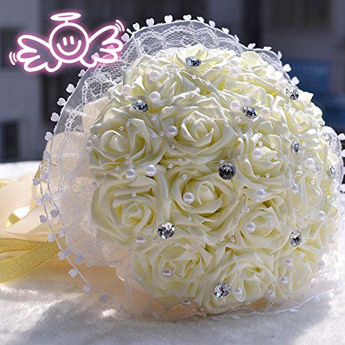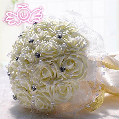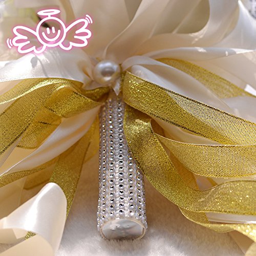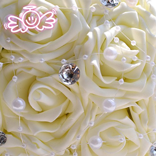 Hestian 18pcs Beige Rose with Rhinestone,pearls Chains Stain Ribbon Handle Bridal Wedding Bouquet Silk Rose Hand Tie