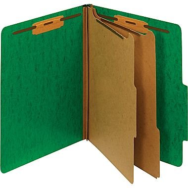 -. Feature : Green / Material: Heavyweight 24 pt. pressboard with Tyvek gussets for durability / Number of fasteners: 6, partitions: 2 / File folder pack size: 6-10/pack / Size: Letter