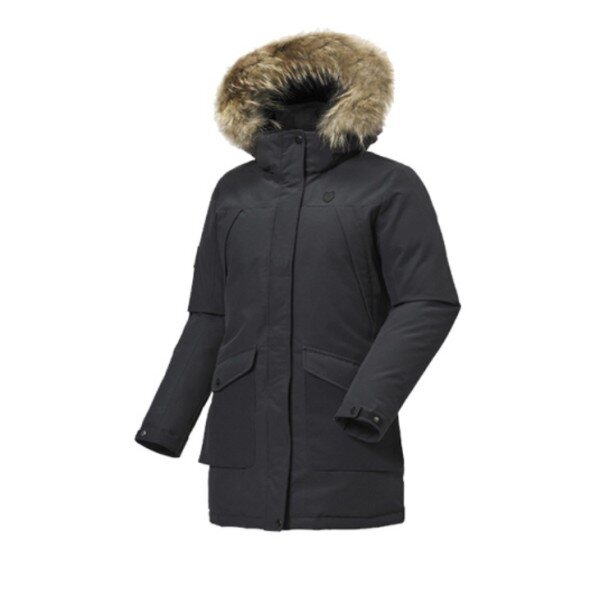 폴리와 코튼이 혼방된 여성용 야상사파리 다운점퍼 8020덕다운을 사용 상하단에 포켓이 있고 하단 포켓에는 3M 반사테잎이 포인트로 디자인됨 후드와 라쿤퍼는 각각 탈부착 가능한제품