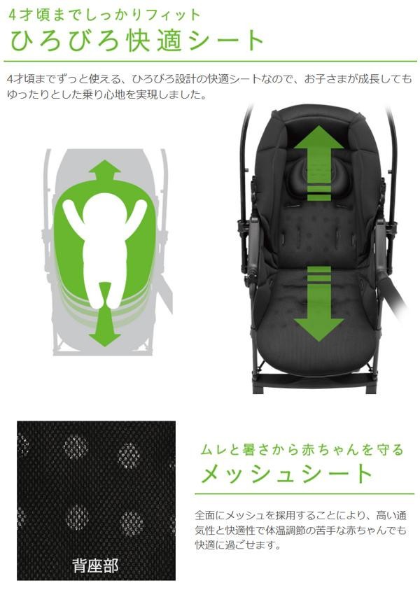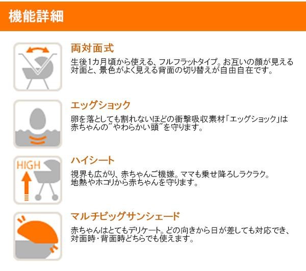 ヘッドサポートに超・衝撃吸収素材「エッグショック」を搭載し、産まれたての赤ちゃんの頭をしっかり守るだけでなく、体温調節の苦手な赤ちゃんを蒸れや暑さから守る「全面メッシュシート」、日差しや紫外線を遮る「ビッグサンシェード」など赤ちゃんにもママにも嬉しい機能満載です。ひろびろ設計シートなので、お子さまが成長してもゆったり快適な乗り心地を実現しました。 |