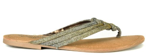 Product Description Flat thong sandal with braided upper detail and triple strap pattern, Glitter fabric upper with a 2-tone metallic sheen, and a Rubber outsole. 0