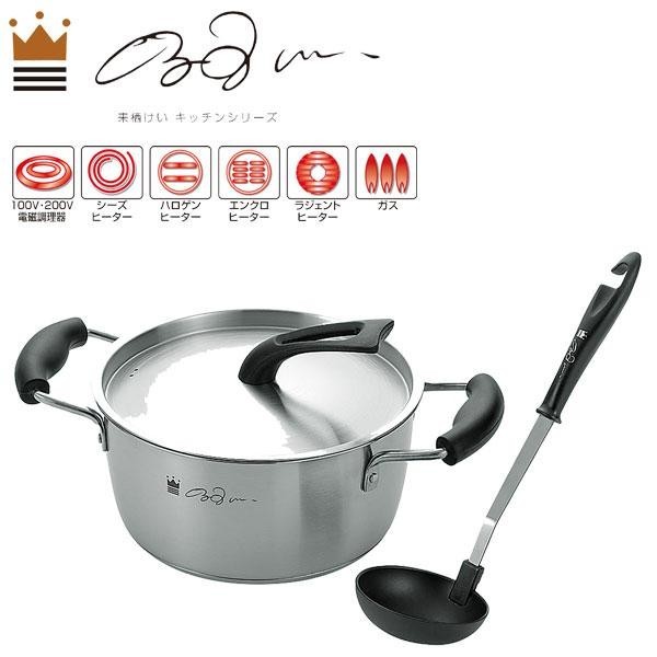 | 素材・材質 | 【両手鍋】 本体:ステンレス鋼(クロム18%、ニッケル8%)(板厚0.6mm) はり底:アルミニウム(板厚2.0mm)+ステンレス鋼(クロム18%)(板厚0.5mm) 蓋:ステンレス鋼(クロム18%、ニッケル8%) 取っ手・蓋ツマミ:フェノール樹脂 取っ手金具:ステンレス鋼 【お玉】 皿部:66ナイロン樹脂 ハンドル部:ポリプロピレン樹脂、ステンレススチール |