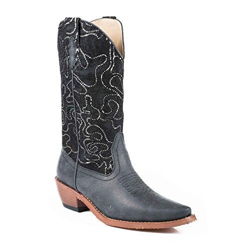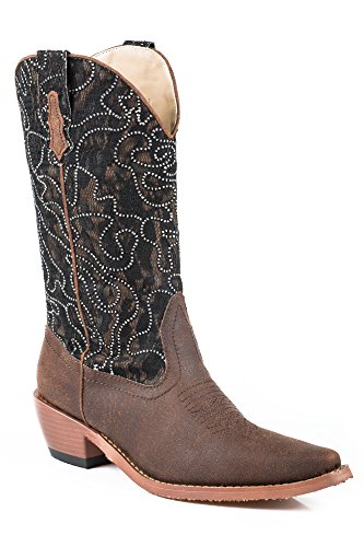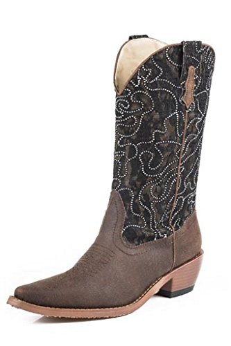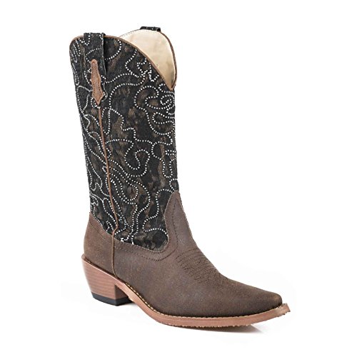 Studio : Roper Publisher : Roper Binding : Apparel Product Description Step into these boots and shine a little, cowgirl. These fashionable boots by Roper feature a snip toe, faux leather foot, and dazzling crystal lace fabric on the shaft. You can walk in comfort all day with the soft cushioned insole, while the high fashion heel gives these boots a pop. 0