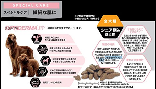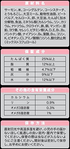 原材料:サーモン、とうもろこし、米、コーングルテンミール、大豆ミール、ビートパルプ、卵、動物性油脂、コーンスターチ、セルロース、チコリ、たんぱく加水分解物、大豆油、魚油、ミネラル類(カルシウム、リン、カリウム、ナトリウム、クロライド、鉄、銅、マンガン、亜鉛、ヨウ素、セレン)、ビタミン類(A、D、E、B1、B2、パントテン酸、ナイアシン、B6、葉酸、B12、コリン、K、ビオチン、C)、酸化防止剤(ミックストコフェロール)