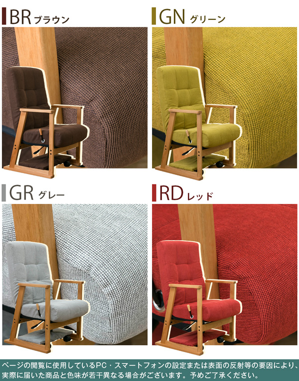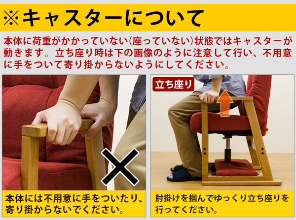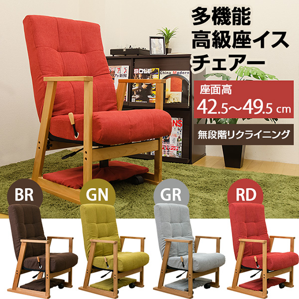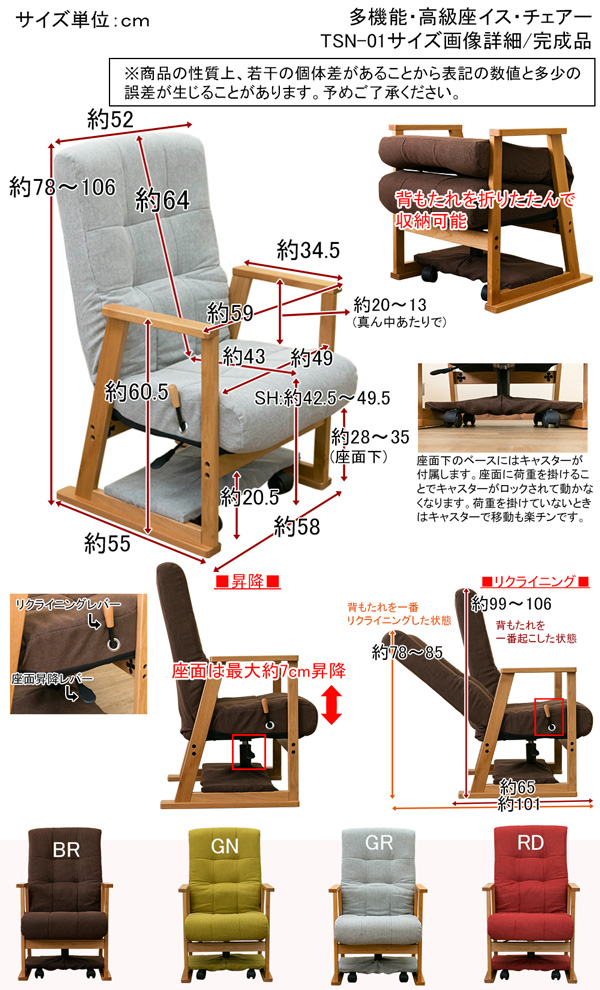 本商品はお取り寄せ商品のため、稀にご注文入れ違い等により欠品・遅延となる場合がございます。誠に恐れ入りますが、何卒ご了承ください。 また、以下の場合には追加送料がかかる場合がございます。  ・大型商品の複数購入時 ・同梱区分が異なる商品の複数購入時  【出荷目安】:1 - 4営業日 ※土日・祝除く 【同梱区分】:TS 1490 【梱包サイズ】:大型商品 【代引き決済】:不可  配送伝票の依頼主は出荷元(メーカーもしくは仕入元)名となる場合がございますので、お受け取りの際はご注意ください。   【型番】tsn01  【商品名の色やサイズについて】 こちらは「高級座椅子/リクライニングチェア 【レッド】 肘付き 張り地:ファブリック生地 キャスター付き 【完成品】」の商品ページです。商品画像や商品情報には、色違いやサイズ違いの商品が載っている場合がございます。ご注文前に色・サイズ・セット内容のご確認をお願いいたします。  多機能 高級座椅子チェアです  座面は約7cm昇降します レバー操作でリクライニングします 脚部にはキャスターが付いています 座面に荷重を掛けることでキャスターがロックされて動かなくなる構造です 荷重を掛けていないときはキャスター付きなので移動がスムーズに出来ます ※荷重がかかっていないときはキャスターが動いてしまうので、立ち上がりの際はご注意下さい 背もたれを手前に折りたたむことが出来るので、収納する際省スペースですみます 張り材はファブリックで肌触りがいいです  ブラウン(BR)、グリーン(GN)、グレー(GR)、レッド(RD)の4色展開です  幅590×奥行650~1010×高さ780~1060mm(梱包サイズ:幅650×奥行670×高さ640mm) 座面高:約425~495mm 本体重量:16.2kg(梱包重量:19.2kg) 完成品(1個口) 座面:張り材/ファブリック(ポリエステル100%)、内材/ウレタンフォーム 脚:アルダー材(ラッカー塗装) ナイロンキャスター、シリンダー  原産国:台湾  【ご注意事項】 ※本商品は、北海道・沖縄・離島への配送はいたしかねます。あらかじめご了承ください。