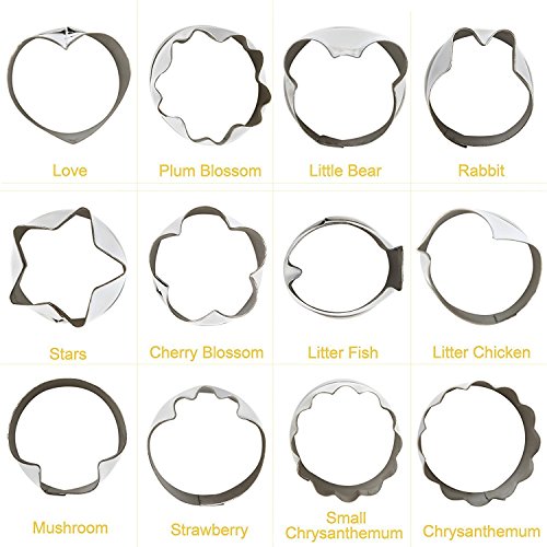 Package contains: 1 Set = 12 Pcs Food Slicer Size: 1 Large cutter (Approx. 1.5 x 2 in/3.8 x 5.3 cm): Chrysanthemum 11 Small cutters (Approx. 1 x 1.6 in/2.5 x 4 cm): Chrysanthemum, Plum blossom, Sakura, Strawberry, Mushroom, Love Heart, Star, Mickey(Bear), Bunny Rabbit, Fish, Chicken