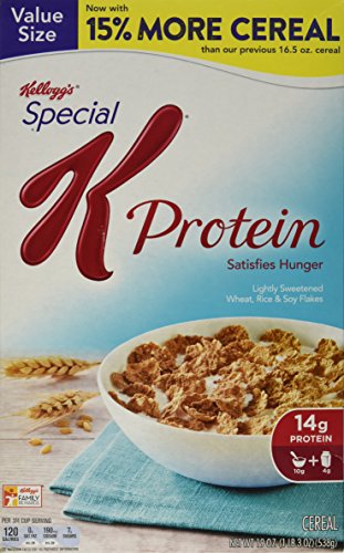 -. Binding : Grocery -. Brand : Special K -. EAN : 0038000143670 -. Feature : Made with Whole Grains / Good source of Fiber / Good source of Protein -. Label : Kellogg Company - Sortable -. Manufacturer : Kellogg Company - Sortable -. PackageQuantity : 1 -. ProductGroup : Pantry -. ProductTypeName : GROCERY -. Publisher : Kellogg Company - Sortable -. Studio : Kellogg Company - Sortable -. Title : Special K Kellogg's Cereal, Protein, 19 Ounce -. UPC : 038000143670