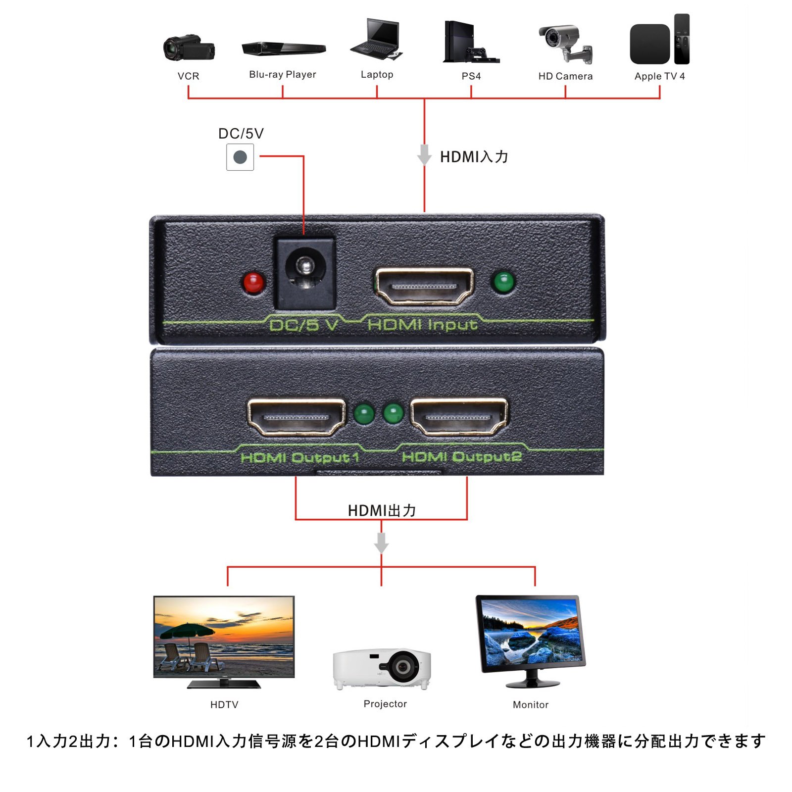 Supports 4k full high vision video You can simultaneously distribute and output signals from one HDMI input device to two HDMI output devices while maintaining high image quality and high sound quality.
