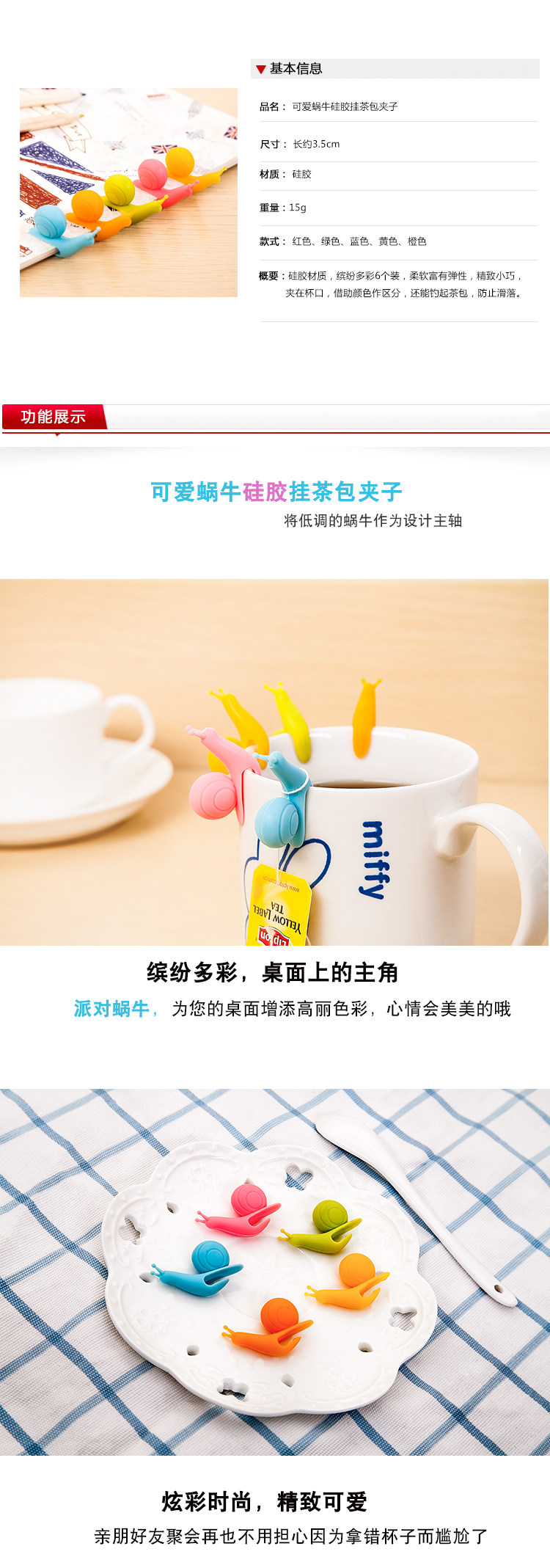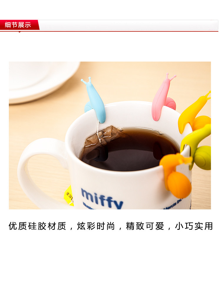 Silicone material, colorful, soft, flexible, compact, caught in the cup, with the colors do differentiate, but also lifted the tea bags to prevent falling.
