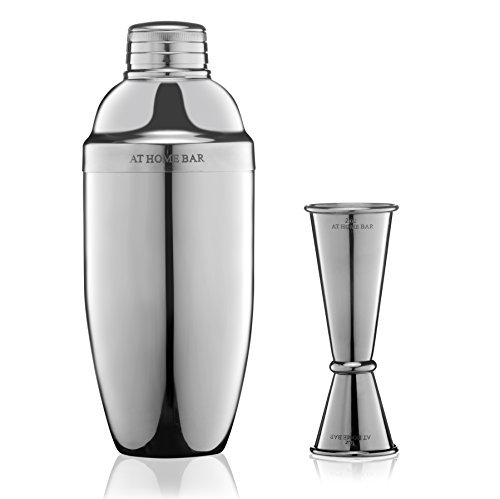 Premium Cocktail Shaker and Jigger Bar Set by At Home Bar - 24oz Martini Shaker and Double Jigger with Measurement Markings - Stainless Steel Cocktail Shaker Set