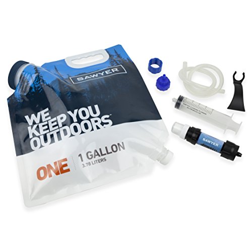 This package includes a dual-threaded Mini water filter, 1-gallon bladder, cleaning plunger, and gravity hose with adapters. It also comes with Sawyer's Cleaning Coupling accessory, which enables you to effectively backwash and clean the Mini filter using a standard plastic water or soda bottle.