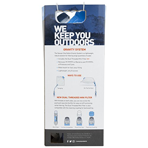 A lightweight, robust solution for filtering large quantities of water, Sawyer's 1-Gallon Gravity System with dual-threaded Mini filter is ideal for backpacking, backcountry camping, and emergency preparedness. With threads on both sides, you can screw the push pull cap onto the Mini for easy on/off functionality while filtering into the included 1-gallon water reservoir.