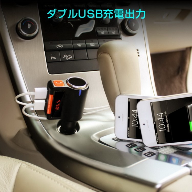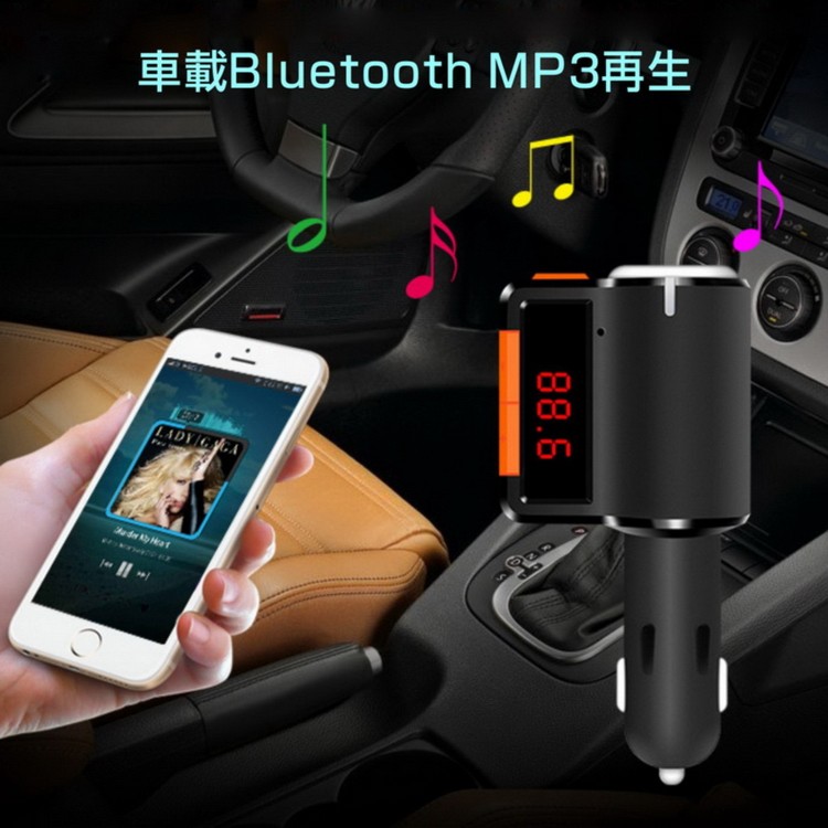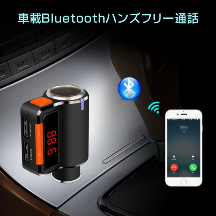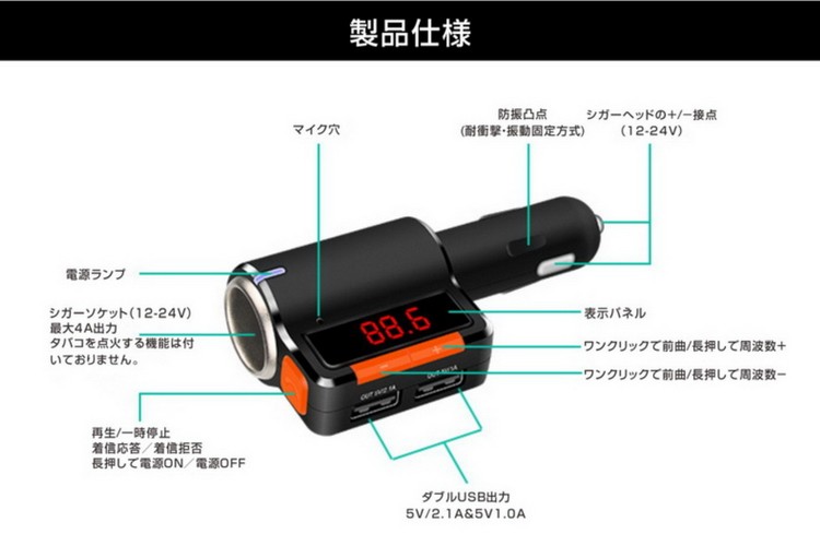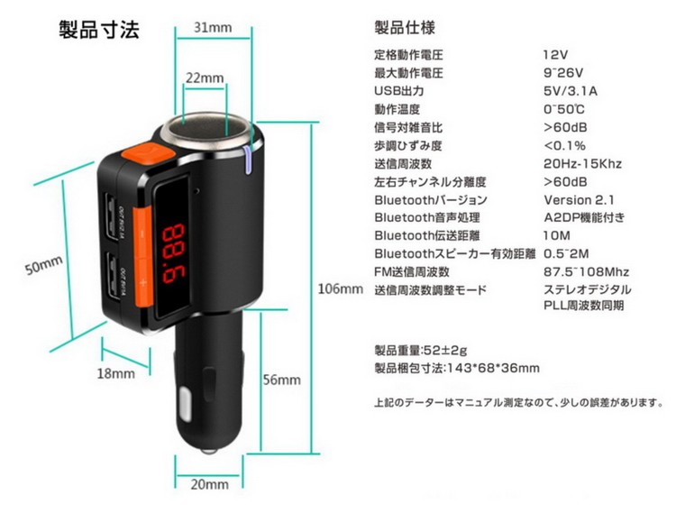 商品詳細 定格動作電圧:12V対応 最大動作電圧:9~26V USB出力:5V(3.1A) 動作温度:0-50℃ 信号対雑音比:>60dB 歩調ひずみ度:<0.1% 送信周波数:20Hz-15khz 左右チャンネル離度:60dB Bluetoothバージョン:Version 2.1 Bluetoothの伝送距離:0.5~2m(環境による) FM送信周波数:87.5~108Mhz 対応ファイル形式:MP3 送信周波数調整モード:ステレオデジタルPLL周波数同期 付属品:日本語取り扱い説明書×1、製品本体×1、パッケージ×1 本製品はハンズフリーBluetooth対応2ポート同時充電、車載FMトランスミッター、高音質、重低音、コンパクトで邪魔にならない設計。 iPhone Galaxy Xperia Z2 Z3 Z4 Z5等...様々な端末に対応。 BluetoothとFM送信により、カーステレオスピーカーにてスマホ・iPad・ipod、スマホナビアプリや電話、音楽を高音質で楽しめます。 ハンズフリー通話可能、ハンズフリーなので運転中の通話も安全に出来ます。 12V対応、ドライブのお供にぜひ本製品で家族や友人、恋人と素敵な時間をお楽しみください。