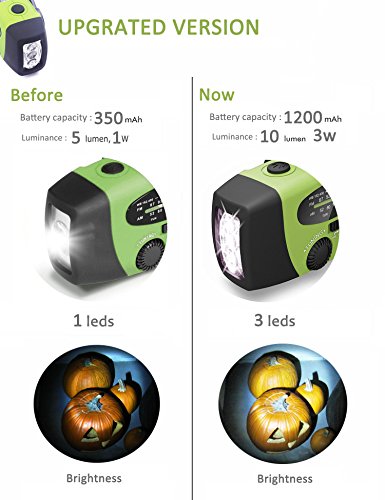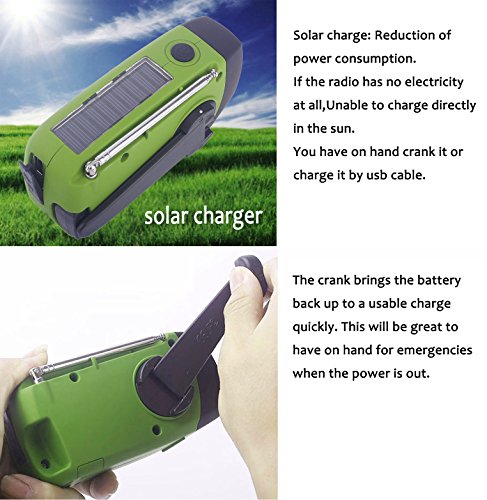 - 4.[Multiple ways to Rechargeable ] Hand crank to wind up internal alternator, recharge by Micro USB port. expose solar panel to direct sunlight( Reduction of power consumption ).Led super bright LED flashlight to give extra convenience in darkness.