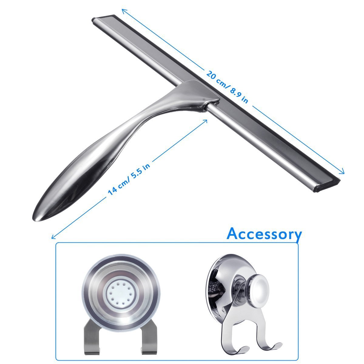 Material: Wiper: Stainless steel + Zinc alloy (handle) + rubber; Holder: Stainless steel (hook) + plastic electroplating