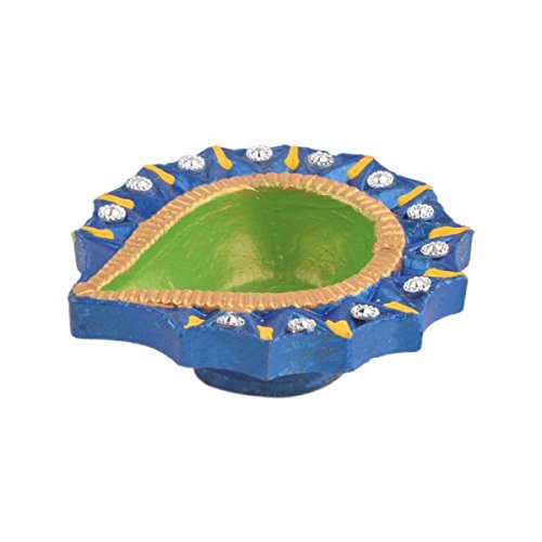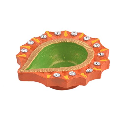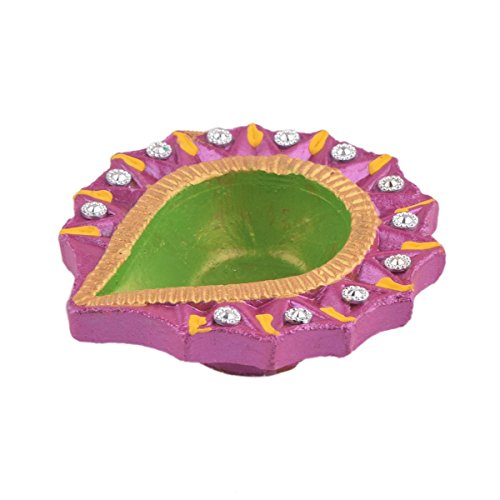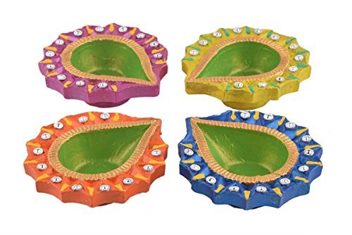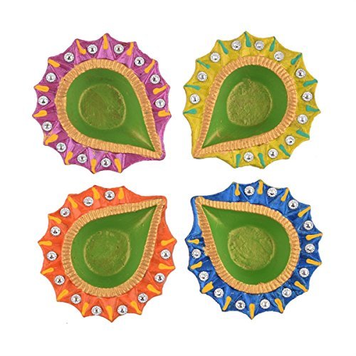 Set of 4 Handmade Decorative Diwali Clay Store Indya Earthen Clay Terracotta Multicolor Oil Lamps With Rhinestone (Jewel For Pooja)