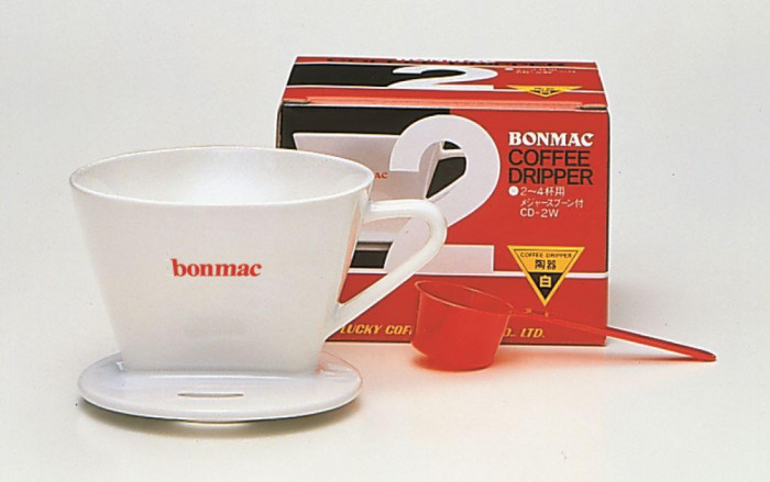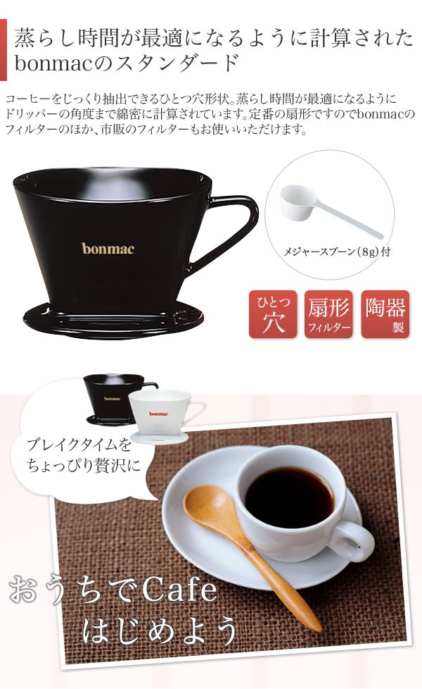 | コーヒーをじっくり抽出できるひとつ穴形状。蒸らし時間が最適になるようにドリッパーの角度まで綿密に計算されています。定番の扇形ですのでbonmacのフィルターのほか、市販のフィルターもお使いいただけます。 |